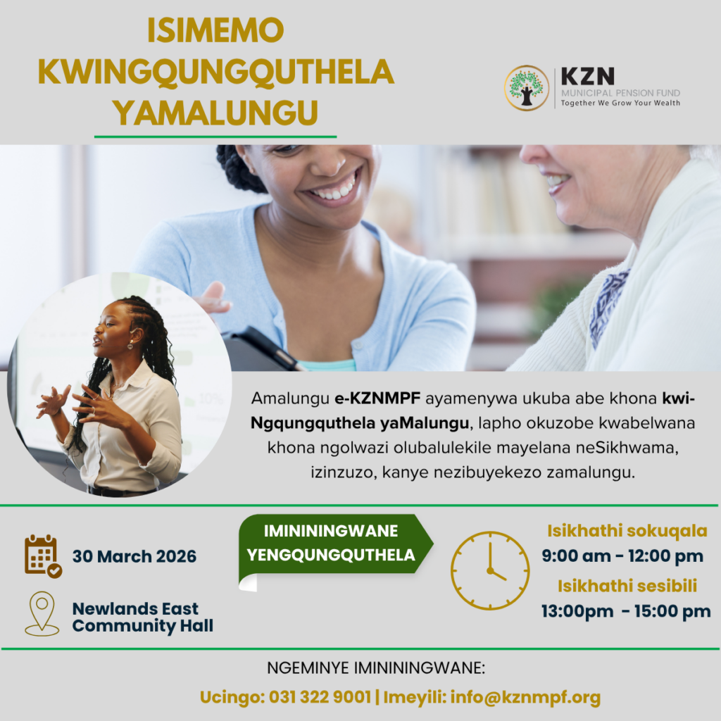 Any articles, templates, or information provided by KZN Municipal Pension Fund on the website are for reference only. While we strive to keep the information up to date and correct, we make no representations or warranties of any kind, express or implied, about the completeness, accuracy, reliability, suitability, or availability with respect to the website or the information, articles, templates, or related graphics contained on the website. Any reliance you place on such information is therefore strictly at your own risk.